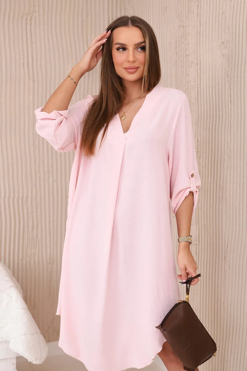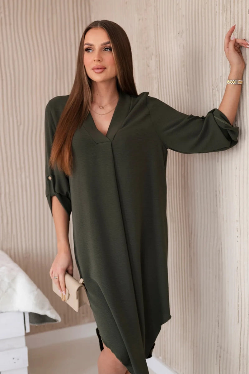 Роклята с V-образно деколте е класически и елегантен избор, който подчертава шията и деколтето, придавайки на силуета тънък и елегантен вид. Този универсален стил на обличане работи перфектно при много различни обстоятелства, от по-официални събития до случайни срещи. Благодарение на своята гъвкавост, роклята с V-образно деколте е чудесен избор за жени с всякаква фигура и стил. Може да се носи с обувки на ток за вечерни излизания, с балетки за ежедневни срещи и дори с дънково яке за по-ежедневни поводи. Не без причина роклите с V-образно деколте се считат за класически, защото подчертават предимствата на фигурата, като същевременно добавят елегантност и женственост към всеки стил. Размерът е универсален и ще бъде подходящ за жени, носещи размер S, M или L.