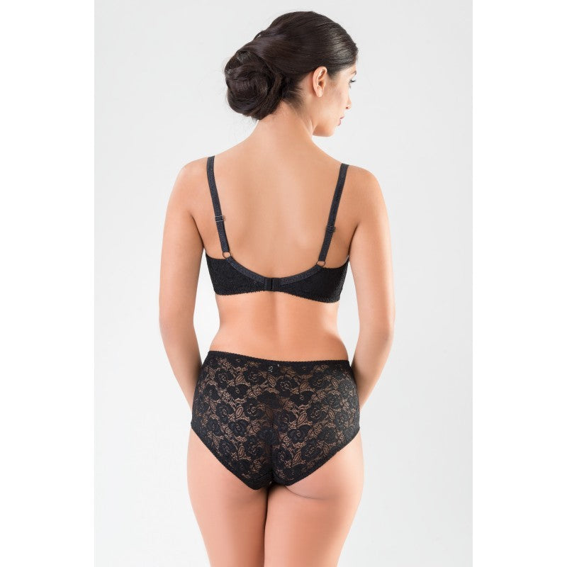Модел с мека подплатен в основата с банели в черен цвят, украсен с дантела в горната част с лилави цветя.Качествена материя. Презрамките са тесни,несменяеми и регулируеми. С нежна дантела в горната част на чашката.