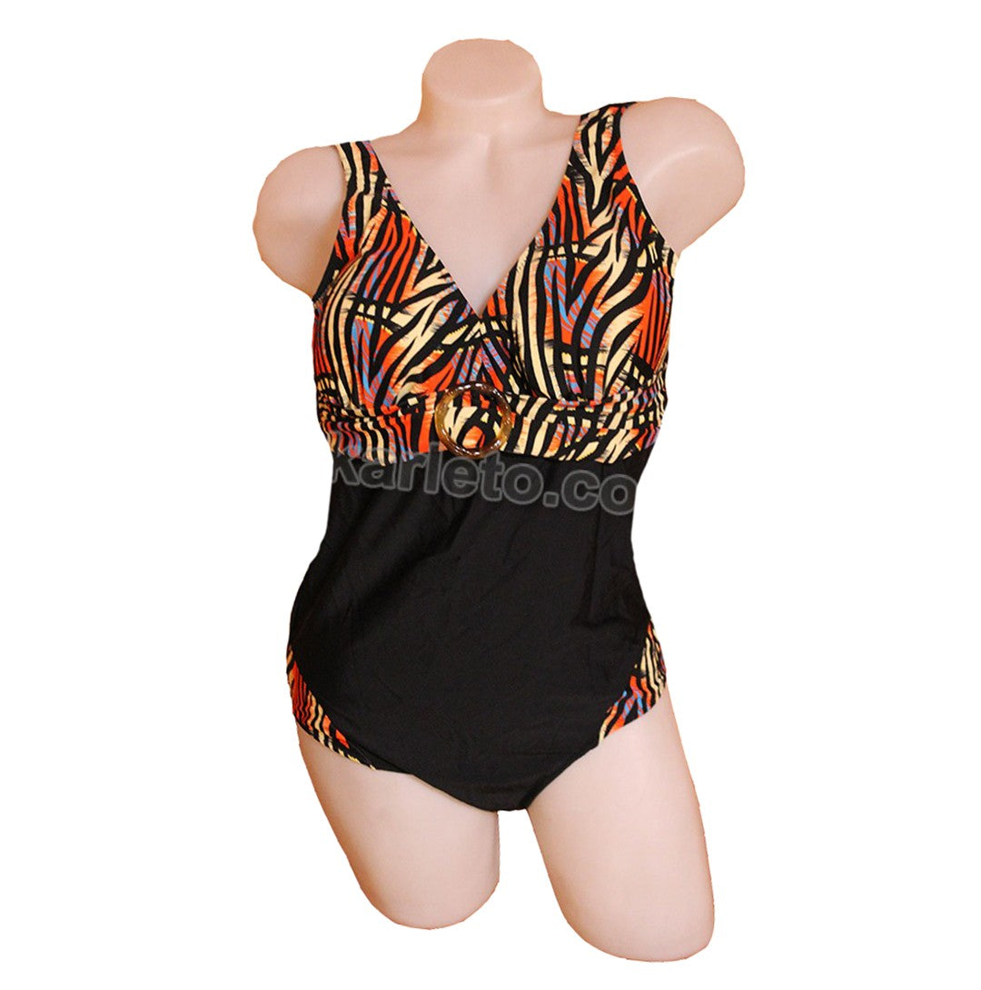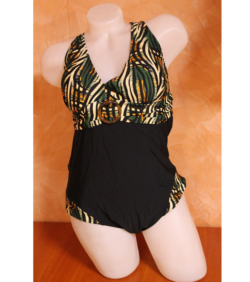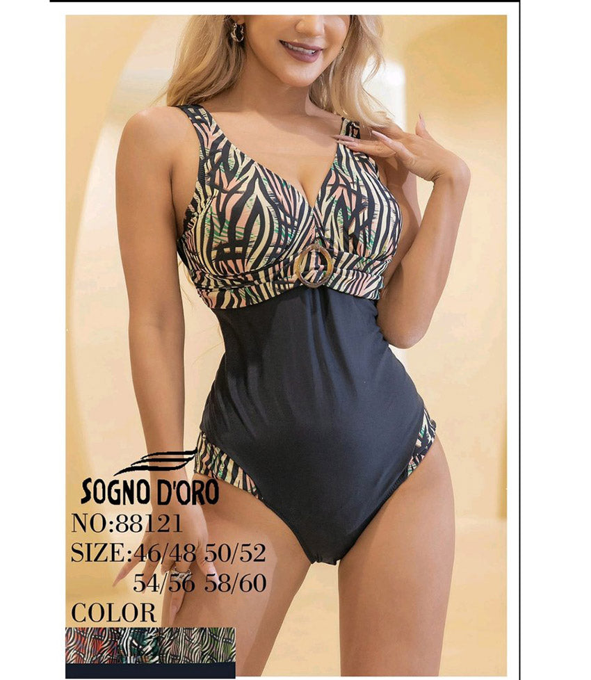 Цял бански с остро деколте 88121. Модел с меки чаши и с леки подложки, които могат да се махат. Колан с катарама в основата на бюста.